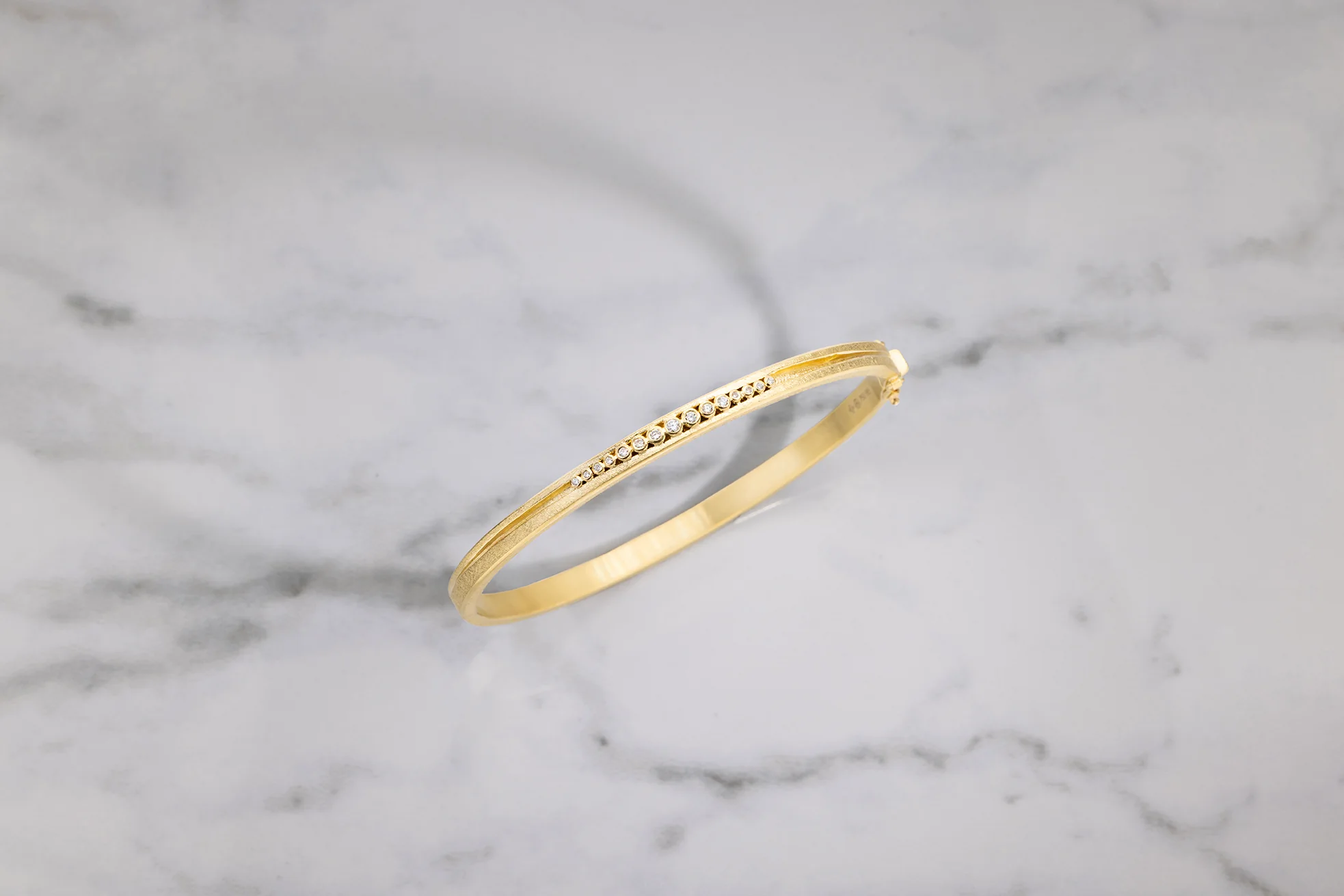 Beautiful hinged bangle hand fabricated in 18 karat yellow gold with white brilliant cut diamonds.
