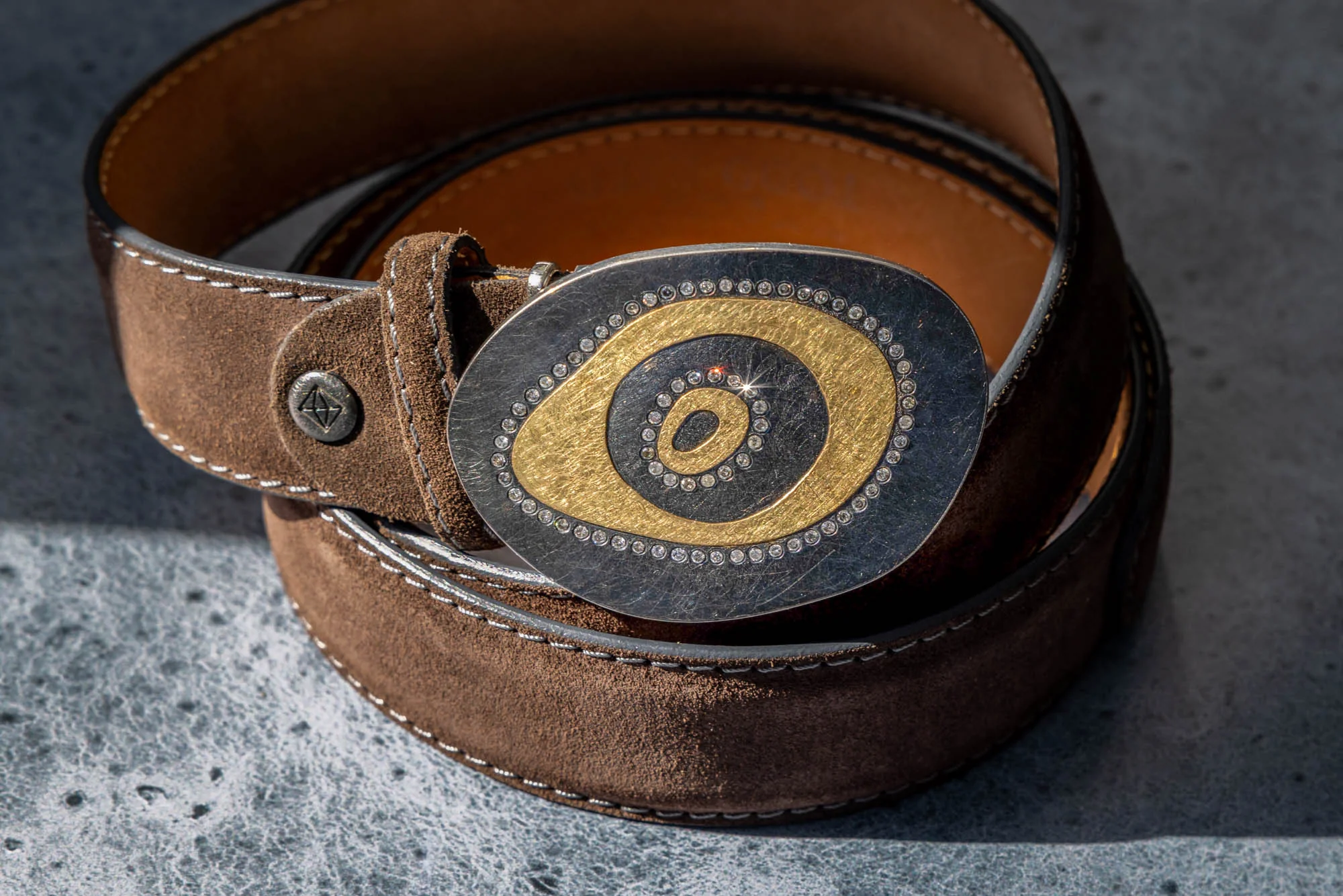Belt with oval shaped organic forms, sterling silver with patina and 18k yellow gold, with white and silver brilliant cut diamonds