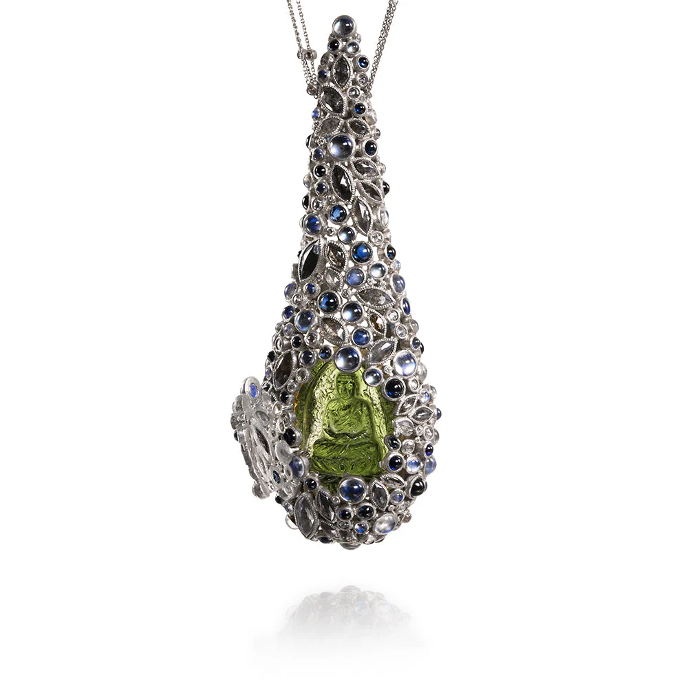 One of a kind hand fabricated pendant necklace with fancy cut diamonds, brilliant cut diamonds, rose cut diamonds, sapphires, and blue moonstone set in 22 karat yellow gold, palladium, and platinum with a hand carved moldavite buddha resting inside.