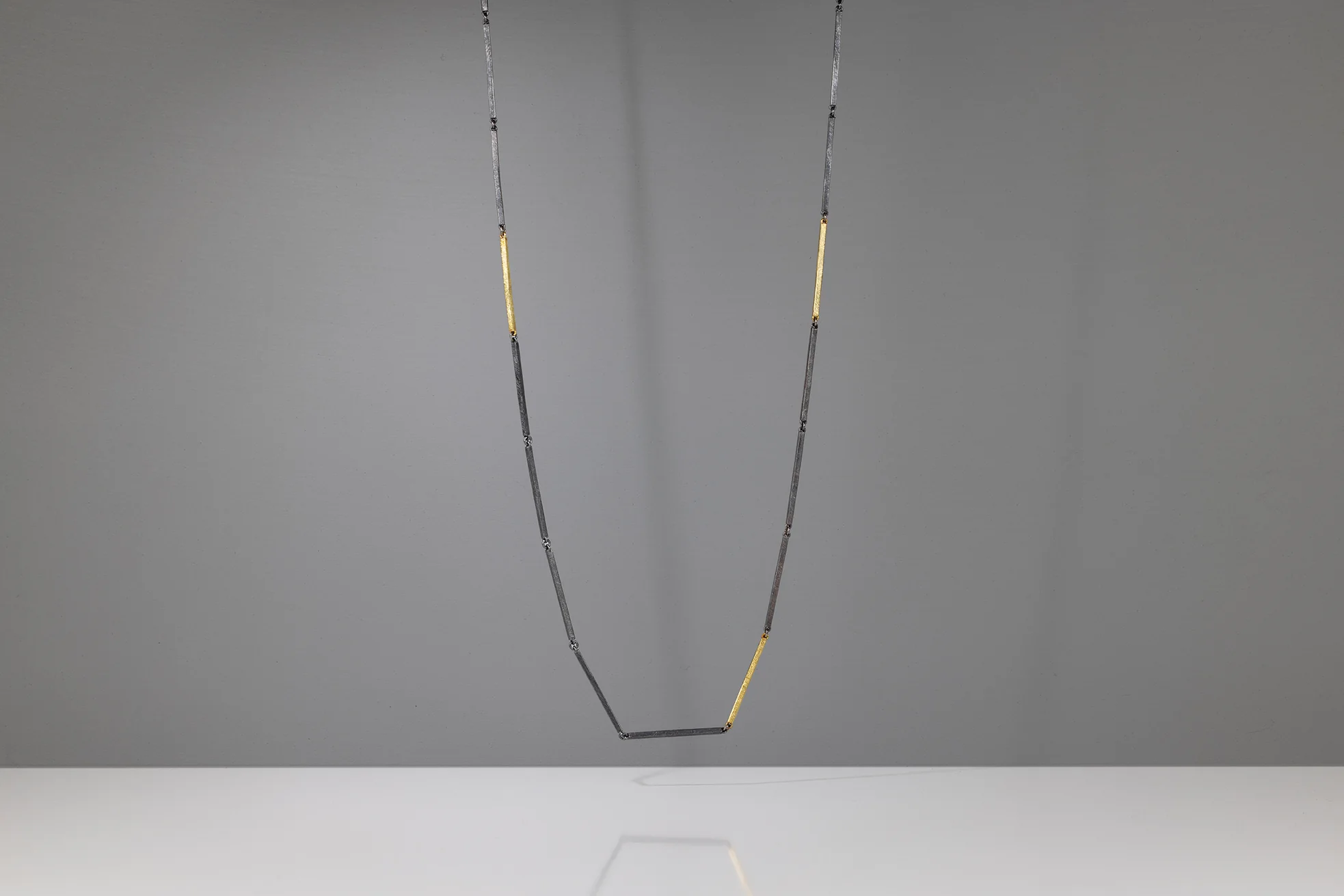 This simple sterling silver and 18 karat yellow gold bar necklace comes in 3 lengths making it perfect for wearing alone or layering.Â