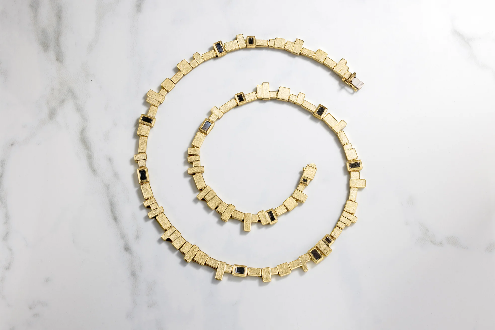 Hand fabricated link necklace with black baguette diamonds set in 18 karat yellow gold