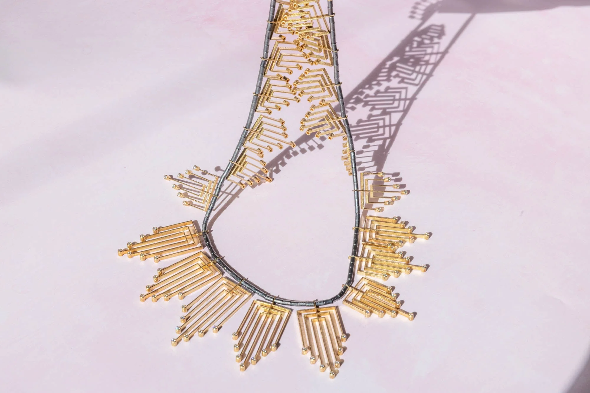 Beautiful hand fabricated bib necklace with white brilliant cut diamonds set in 18 karat yellow gold and patinated sterling silver.