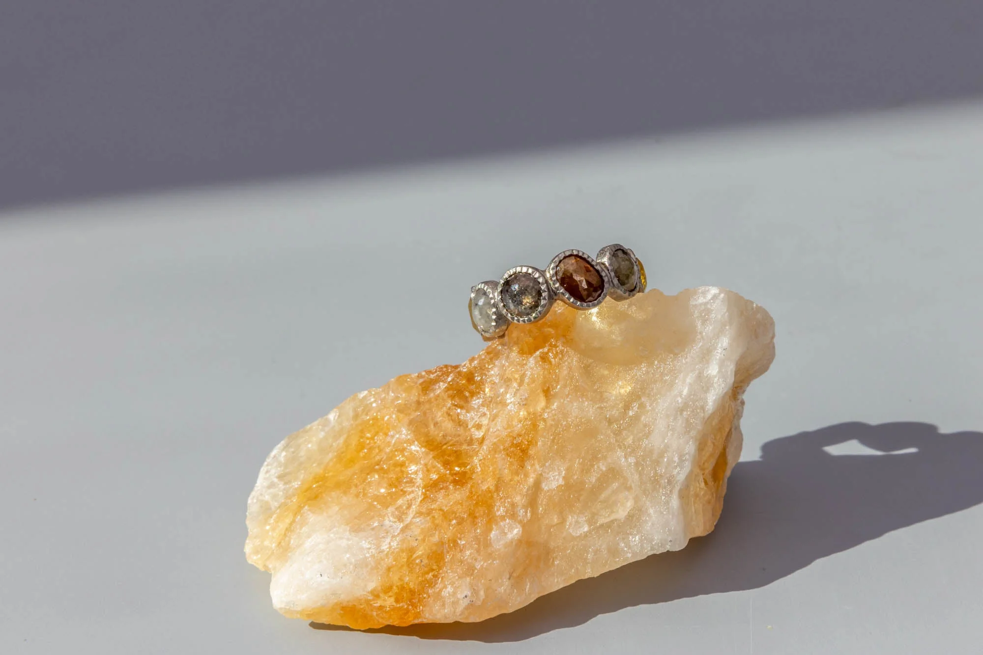 Hand fabricated ring with natural colored fancy cut diamonds and rose cut diamonds set in palladium.